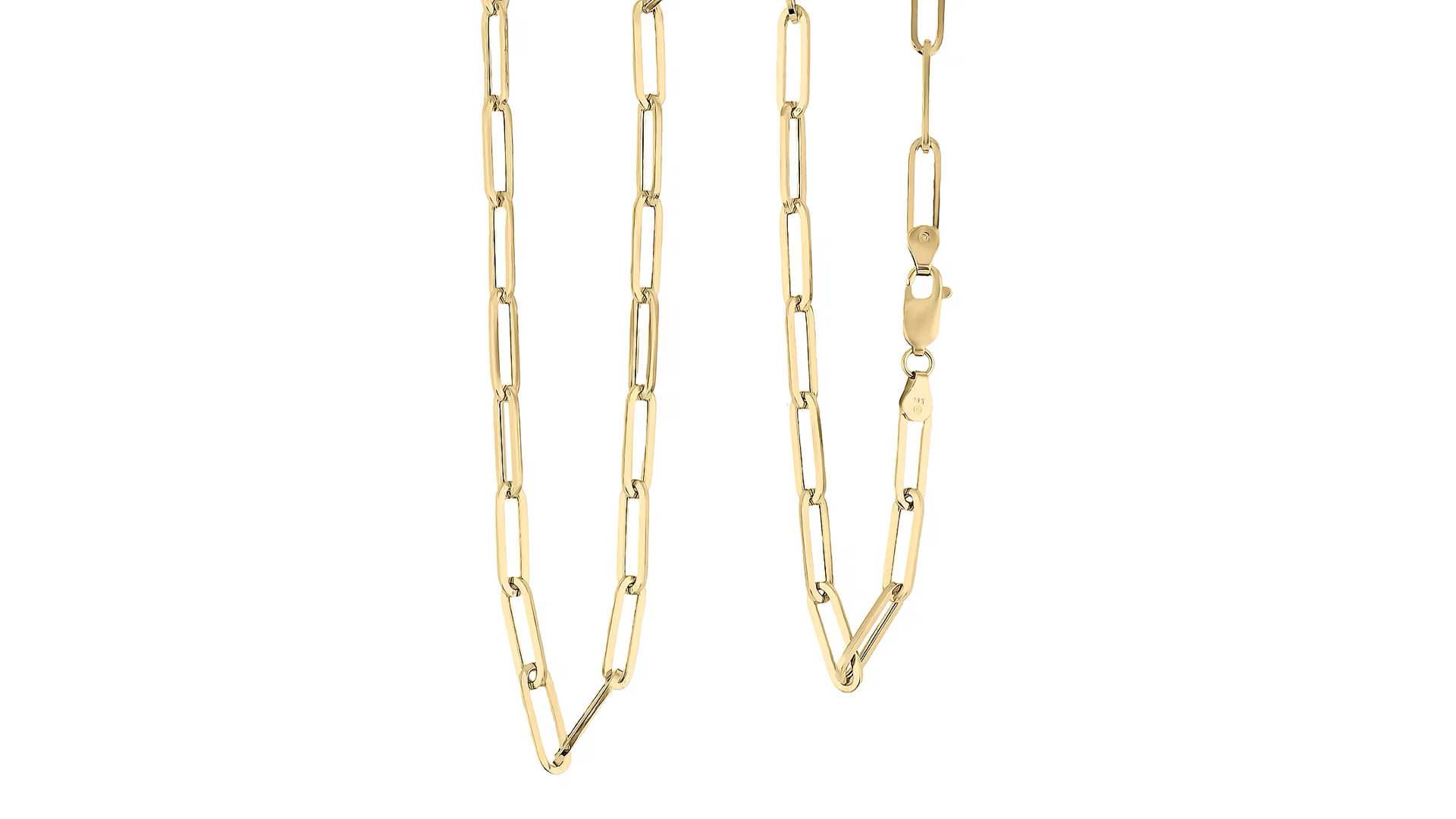 The 10K Gold Paper Clip Chain Necklace is 24 inches and weighs 6.7 grams. The style was designed to work solo or layered with other pieces.