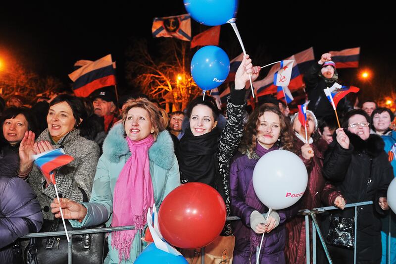 Sevastopol residents celebrate after Crimeans voted in a referendum to join Russia and break away from mainland Ukraine. (Petr Kassin/Kommersant Photo via Getty Images)