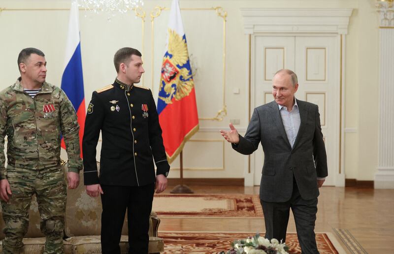 Russia's President Vladimir Putin attends a meeting with service members, involved in the country's military campaign in Ukraine, at the Novo-Ogaryovo state residence outside Moscow.