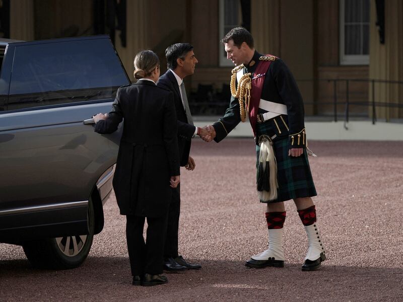 Rishi Sunak is greeted by King Charles III's equerry, Lieutenant Colonel Johnny Thompson, as he arrives at Buckingham Palace, London, for an audience with Charles, October 25, 2022.