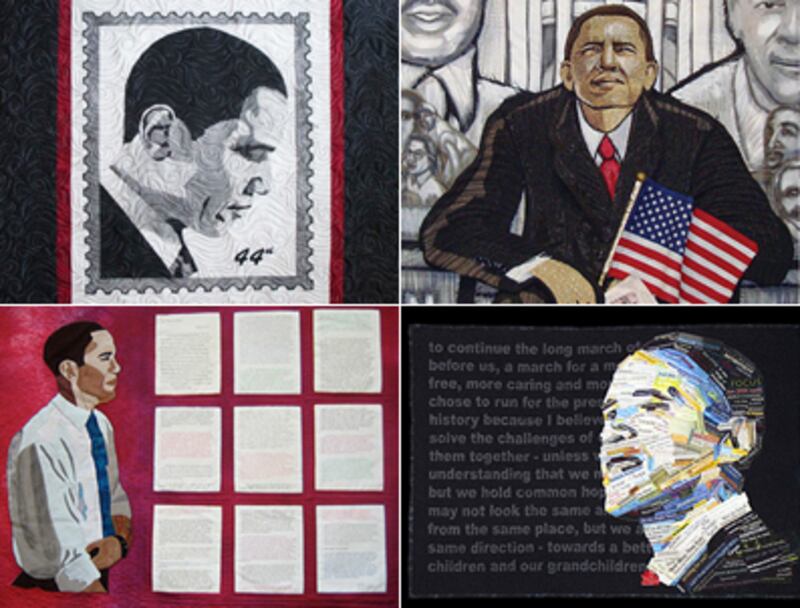 There were so many Obama quilts, in fact, that curators organized to build shows around them. Roland Freeman, a collector and curator of African-American quilts, decided to put together a serious exhibit of Obama quilts, and reached out to well-known textile artists across the country to make a quilt for the show, or contribute one they had already made. That show, “ Quilts for Obama: An Exhibit Celebrating the Inauguration of Our 44th President” opened at the Historical Society of Washington, D.C. just before the inauguration and continues through July. Another show of 60-some Obama quilts organized by quilter/campaign worker Sue Walen in Bethesda, Maryland, has concluded its run at a college art museum.