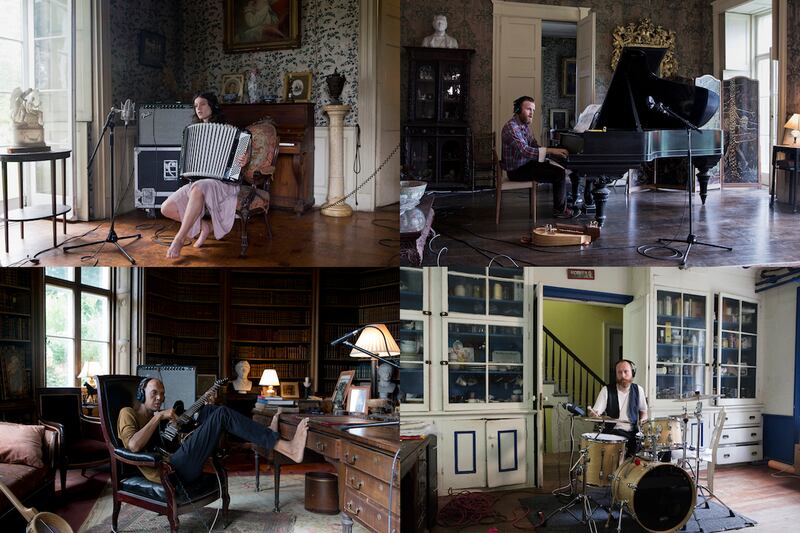 Four stills from the brilliant nine-screen video projection called “The Visitors”, produced by the Icelandic artist Ragnar Kjartansson and now showing at Luhring Augustine gallery in New York. One day not too long ago, Kjartansson and eight of his Brooklynish friends occupied nine rooms and sites in and around a shabby-chic mansion called Rokeby Farm, upstate in New York. Together (but apart), and in one 53-minute take, they recorded a slightly sentimental, nouveau-hippy song, each one contributing a separate musical line on voice, piano, electric bass, accordion, drums or some other classic-rock instrument. Rokeby Farm says that it is set up to “welcome bohemia and spirituality in all its forms”, and the video made there risks bathing in the same kinds of sentimental cliche. But as the sound weaves together in the gallery space, and the images remain discrete, you realize that Kjartansson’s romantic excesses are perfectly balanced by his technophilic rigor. The technology seems to provide its own ironic gloss on the song’s mawkishness.