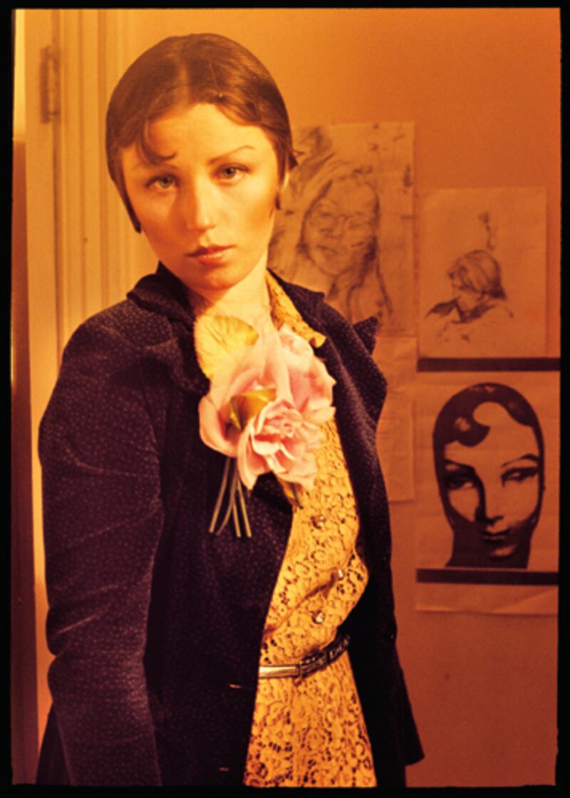 A hand-colored self-portrait shot in 1975, from a series of three. This time, the casual photo-booth look was faked by Sherman.