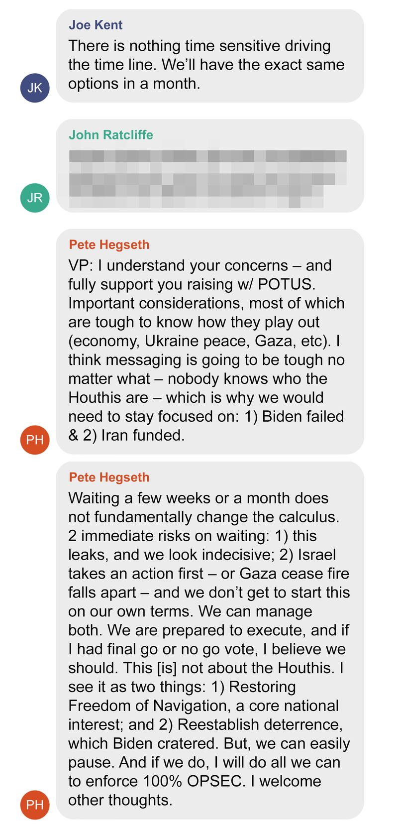 Waiting a few weeks or a month does not fundamentally change the calculus. 2 immediate risks on waiting: 1) this leaks, and we look indecisive; 2) Israel takes an action first – or Gaza cease fire falls apart – and we don’t get to start this on our own terms. We can manage both. We are prepared to execute, and if I had final go or no go vote, I believe we should. This [is] not about the Houthis. I see it as two things: 1) Restoring Freedom of Navigation, a core national interest; and 2) Reestablish deterrence, which Biden cratered. But, we can easily pause. And if we do, I will do all we can to enforce 100% OPSEC. I welcome other thoughts.](https://www.thedailybeast.com/resizer/v2/7FGBS2LHVBDOXN6F65KUO2PGQM.jpg?auth=41db6f613f288b23270005f2f73f651cb20e508fe07d904bcda3e9e30990b03c&width=800&height=1661)