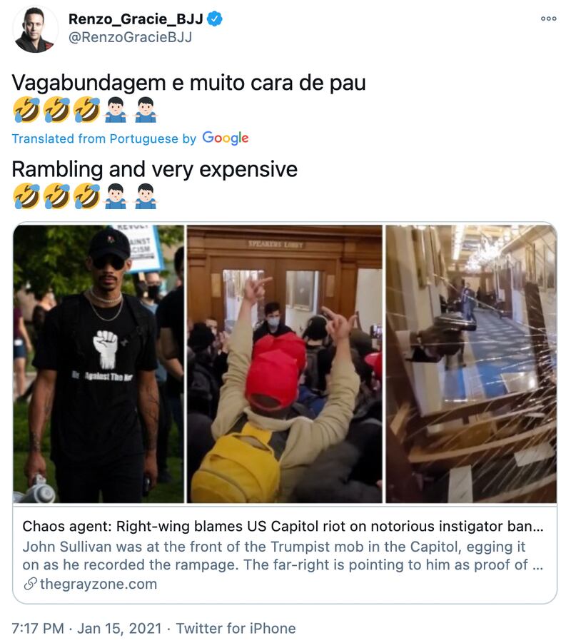 He continued his provocations in August, when he insinuated that 75-year-old Martin Gugino, who was knocked to the ground and bloodied by Buffalo police at a protest over George Floyd’s death, was faking it. He’s also shared memes of Jeffrey Epstein voting for Joe Biden; a post claiming that Biden would bomb Buenos Aires if Brazil doesn’t take good care of the Amazon; defended his right to say the N-word because he supposedly has a Black relative; and shared a false article insinuating that members of BLM and antifa were behind the Capitol riot. If that weren’t enough, the Renzo Gracie Academy franchise’s New Hampshire branch sports the thin blue line flag on a webpage promoting jiu-jitsu training for law enforcement.