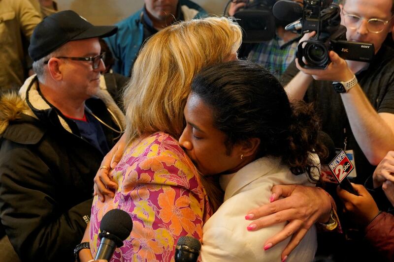 Justin Jones embraces Rep. Gloria Johnson after a vote at the Tennessee House of Representatives to expel him for his role in a gun control demonstration at the statehouse last week.