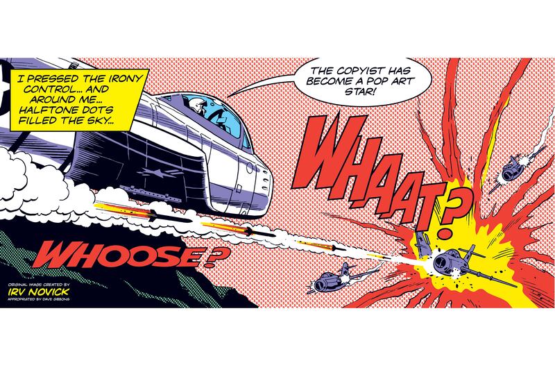 Pictured above is Dave Gibbons' Whaat? which is a less-than-subtle dig at Lichtenstein. Its drawn out 'WHOOSE?' references the aforementioned appropriation issues and the comment of an 'irony control' hits Lichtenstein's reputation as a master of irony in pop art.