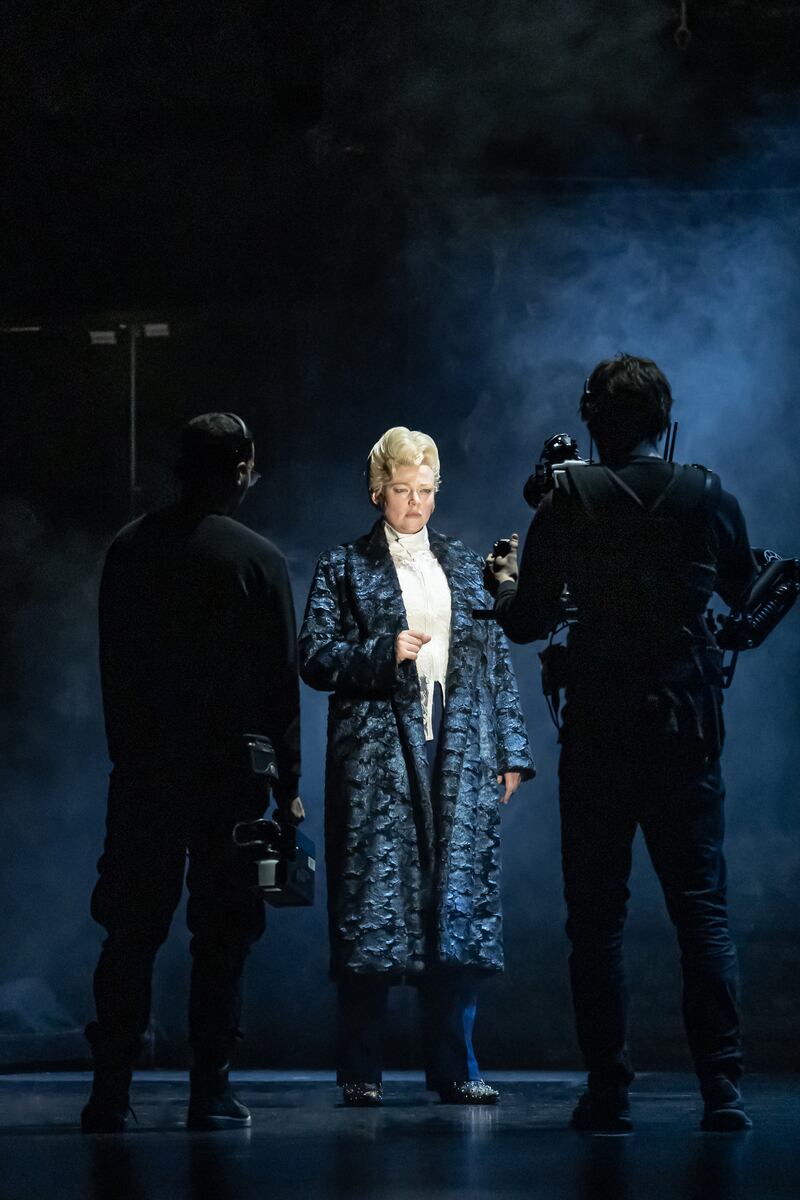 There are only a few moments where Snook is alone center stage with no cameras, delivering lines as if in a conventional play. When it happens it’s a shock—so focused we have been on all the screens, and on the many feats of technical trickery the production excels in. Here, finally, is Snook simply acting, and instead of the screens-as-familiar-accessory-and-crutch, the audience has to pay a more traditional kind of attention.
