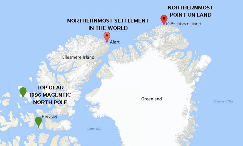 A map shows where the BBC’s Top Gear traveled when trying to reach the Magnetic North Pole, compared to where Araujo wanted to take his client.