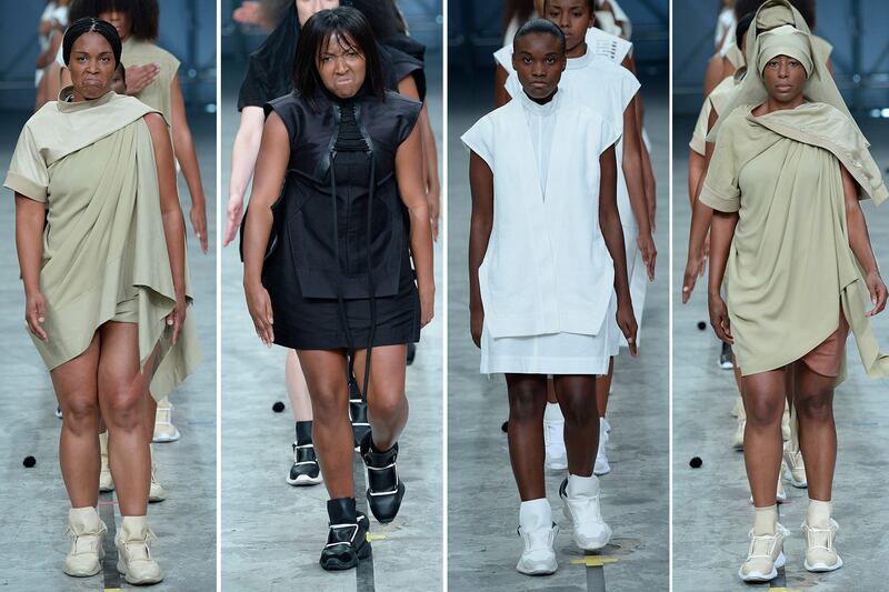 Nun-like habits came down the runway on the dancers -- who came in all shapes and sizes, a refreshing departure from the sea of models seen on runways this week. What better way to react to the recent criticism about lack of diversity on the runway? Rick Owens's show was a celebration of real women.