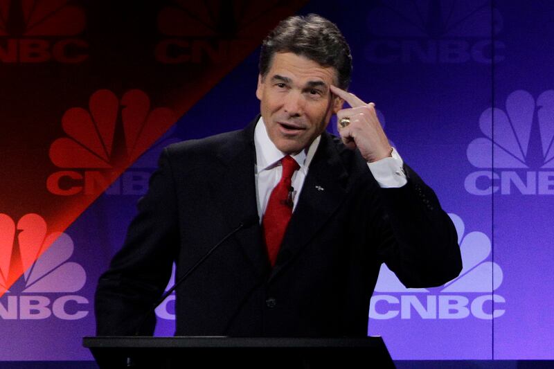 The Rick Perry “piñata” returns: During a Fox debate, the Texas governor launched into what can only be called a confounding attack on Mitt Romney. Going after the former Massachusetts governor’s ever-changing record, Perry got into a tongue twister. “Is it the Mitt Romney that was on the side of against the Second Amendment before he was for the Second Amendment? Was it—was before he was before the social programs, from the standpoint of he was for standing up for Roe v. Wade before he was against Roe v. Wade?” Romney’s response says it all: “Nice try.”