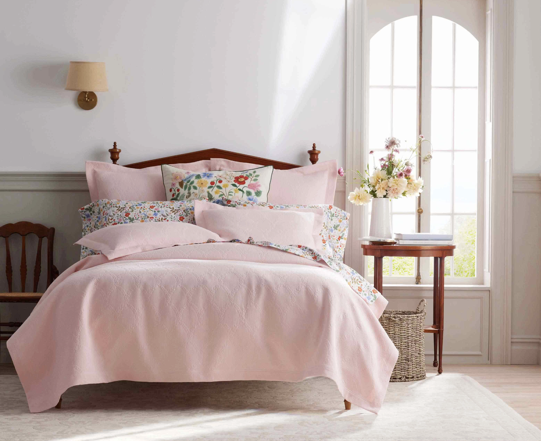 If florals aren’t your thing, no worries. Keep things simple yet beautiful with this not-too-light, not-too-heavy coverlet, which comes adorned in shades of pink, blue, or ivory.