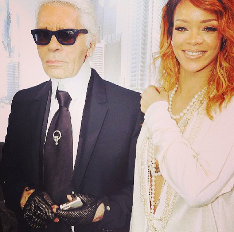 Rihanna was in the City of Light this week, along with many other famous faces, to attend Paris Fashion Week. It’s a good guess to say she’s a fan of Chanel, judging from her bright smile and Chanel bag while posing with designer Karl Lagerfeld after Chanel’s show. It seems that not even the Barbados beauty can put a grin on Lagerfeld’s face, but Rihanna was thrilled, posting, “The man himself @karllagerfeld #PaRih #fashionheaven.”