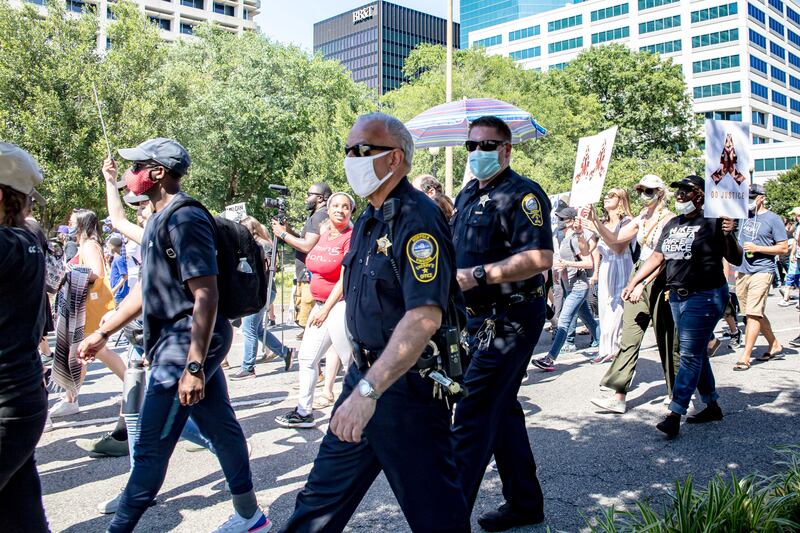 Policemen walk with protesters during the City Collective Prayer March on June 7, 2020, in Norfolk, VA. The event was organized to honor George Floyd, an African-American man from Minnesota who died in police custody on May 25, 2020.
