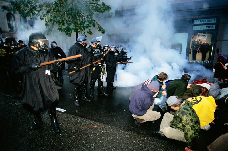 Protesters sitting on the ground are confronted by riot police during the World Trade Organization’s 1999 conference in Seattle.