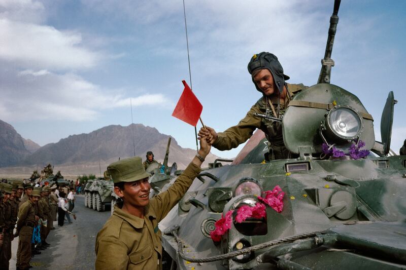 MAY 1988: An Afghan soldier hands a flag in solidarity to a departing Soviet soldier in Kabul on the first day of the army’s withdrawal from Afghanistan.