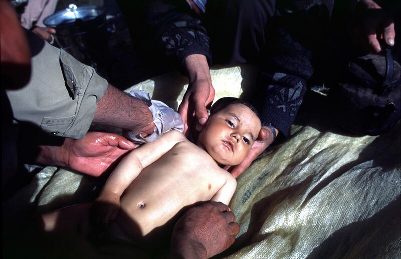 February 2001: At the Maslakh camp for newly arrived IDP's (internally displaced people), Afghans fleeing the effects of a severe drought and serious lack of food, arrive at Herat city seeking emergency shelter and rations. The United Nations Office for Afghanistan has estimated 80,000 Afghans have arrived from western provinces to several Herat camps at the rate of 25-50 families per day. Coordination of relief aid has been hampered by frequent disagreements and confusion with the ruling Taliban government. Figures vary from 150 to 450 people dying due to exposure and respirtory illnesses since mid-january 2001. Here, men and a mullah wash the dead body of a one year old baby, Abdullah, before the traditional islamic burial. The baby died from a flu after sleeping with no shelter outdoors during a rainstorm with his family.