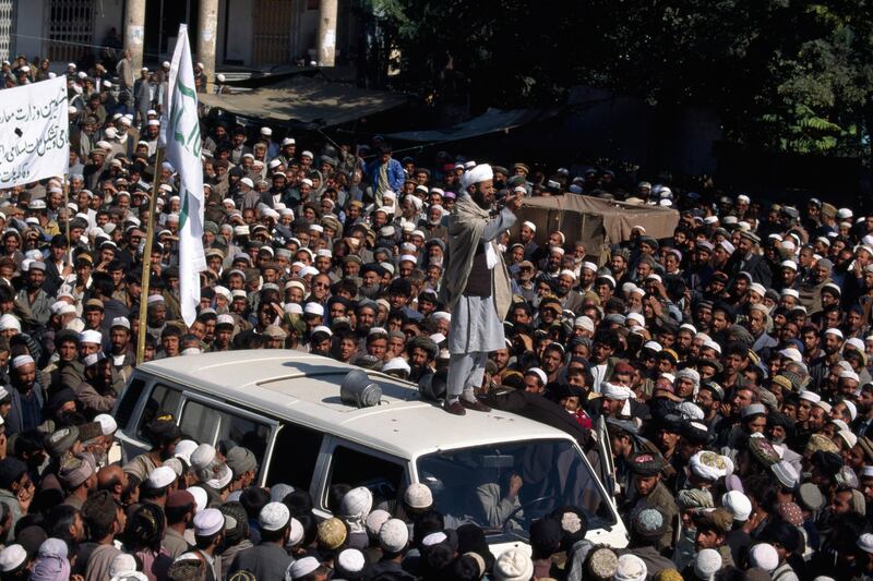 October 1996: A Taliban mullah speaks to a crowd gathered in central in Kabul after Taliban forces took control from the Rabbani government.
