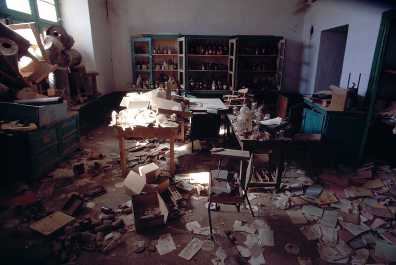 January 1995: Laboratory equipment and research books lie strewn about the floor of a science classroom in a Kandahar school, an area controlled by the Taliban.