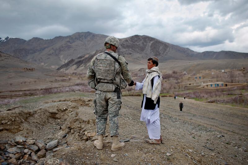 March 2009: An American soldier shaking hands with an Afghan youth outside Jalrez in Wardak province. On the hill where they stand, overlooking apple orchards,there are still trenches that were dug two decades earlier by Afghan mujahideen fighting against Soviet forces.
