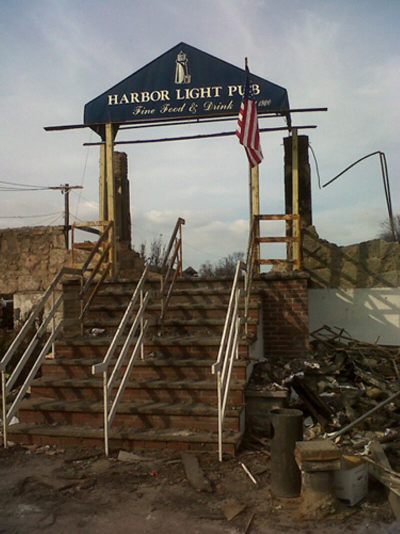 They then set the miraculously unscathed section of canvas bearing the words Harbor Light Pub upon four 4-by-4 beams they had lashed together with plastic ties to the iron railing of the brick stoop that is all that remains of a storied gathering place.