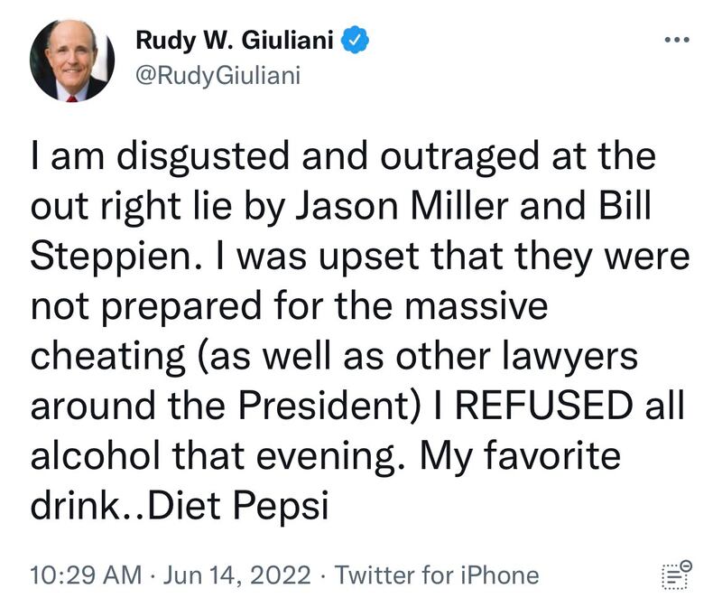 The conspiracy-obsessed lawyer and his allies on Tuesday responded to embarrassing claims aired the day prior by the congressional committee investigating the Capitol riot, insisting he was totally on the wagon on election night.