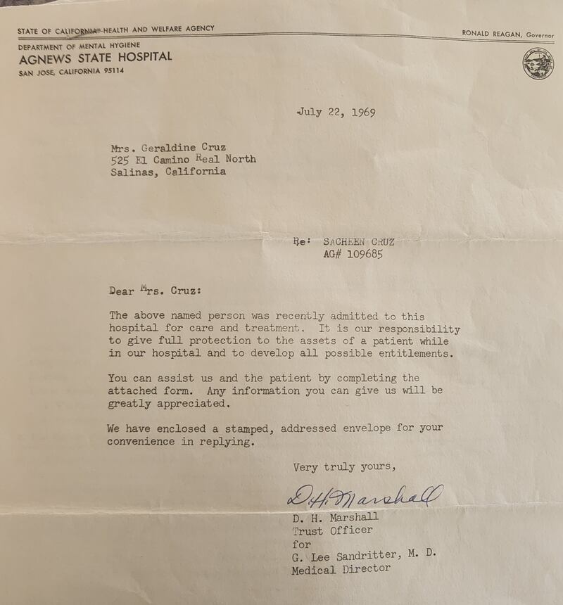 Orlandi wrote that her sister wanted to be different and famous from a young age, ultimately settling upon calling herself Sacheen Littlefeather. “She perfected her identity by becoming immersed into this character,” Orlandi added. “I saw the change over time until she became absorbed into this persona even though we have no such identity in our family history.” Cruz also emailed the THR reporter a scanned copy of the July 1969 admission letter to Agnews State Hospital.