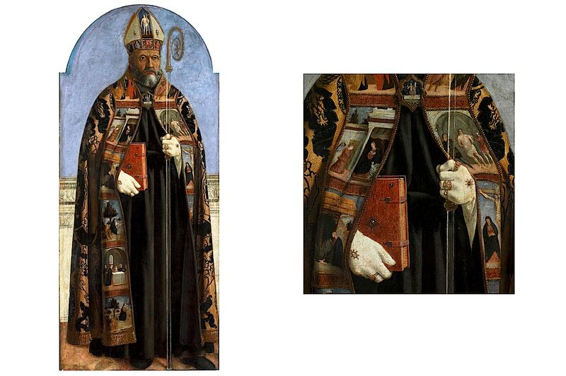 As will be obvious to anyone who has read my PhD dissertation – that would be my supervisor, three examiners (maybe), and my proofreading ex-wife – what interests me here are the little “embroidered” scenes on the edge of Augustine’s robe. Known to specialists as quadri riportati (“transferred pictures”) these scenes are “carried over” into the fictive decorative textiles in the picture, in order to keep intact the illusion of a single, continuous space that Piero creates in the rest of his altarpiece, and that flows between and around all its main panels.
