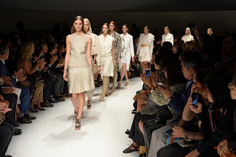 The models, and later the house’s creative director, Massimiliano Giornetti, circled on the oval runway to the beat of a military drum roll at Salvatore Ferragamo's Spring/Summer 2014 show on Sunday evening.