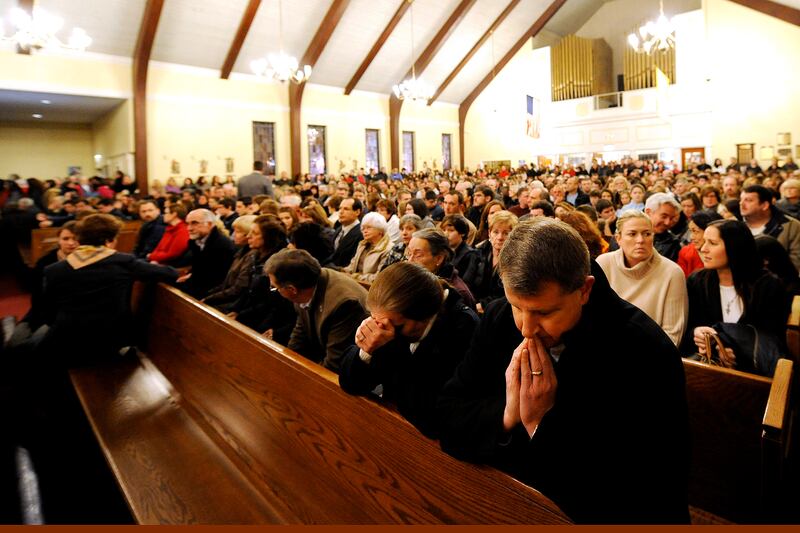 One of many evening prayer vigils was held at Newtown Methodist Church, a small white wooden building that also houses a preschool. Two church members stood outside the Church, embracing each mourner as they walked to the vigil.