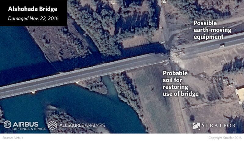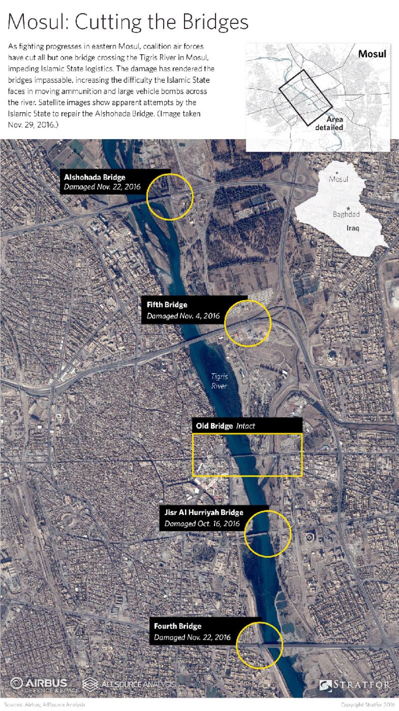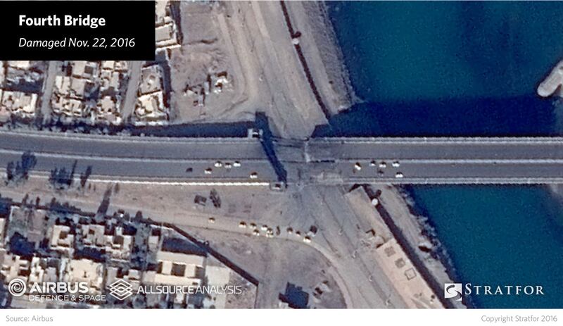 The Old Nineveh Bridge is the only one left for militants or locals to cross, after U.S. air strikes took out four of Mosul’s main river crossings, damage clearly visible in satellite images (live 4 a.m. ET) made exclusively available to The Daily Beast by geopolitical intelligence firm Stratfor.