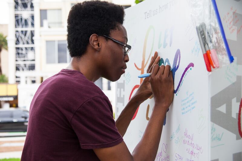 Mary Beth Nickerson signs the wall outside the Pulse nightclub while visiting the memorial.