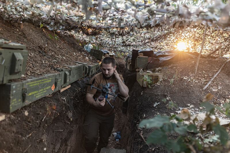 Ukrainian soldier carries a drone in a trench in the direction of Bakhmut as the Russia-Ukraine war continues in the Donetsk Oblast, Ukraine on August 10, 2024.