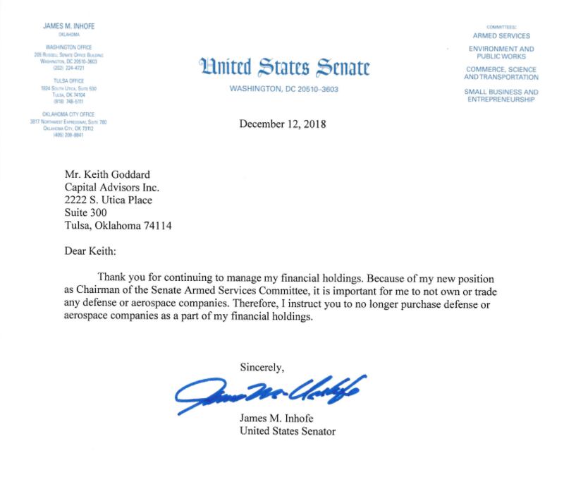 “All of Senator Inhofe’s financial transactions are handled by a third-party advisor,” wrote spokesperson Leacy Burke in an email. “The senator has had no involvement in and has not been consulted about his stock transactions.”