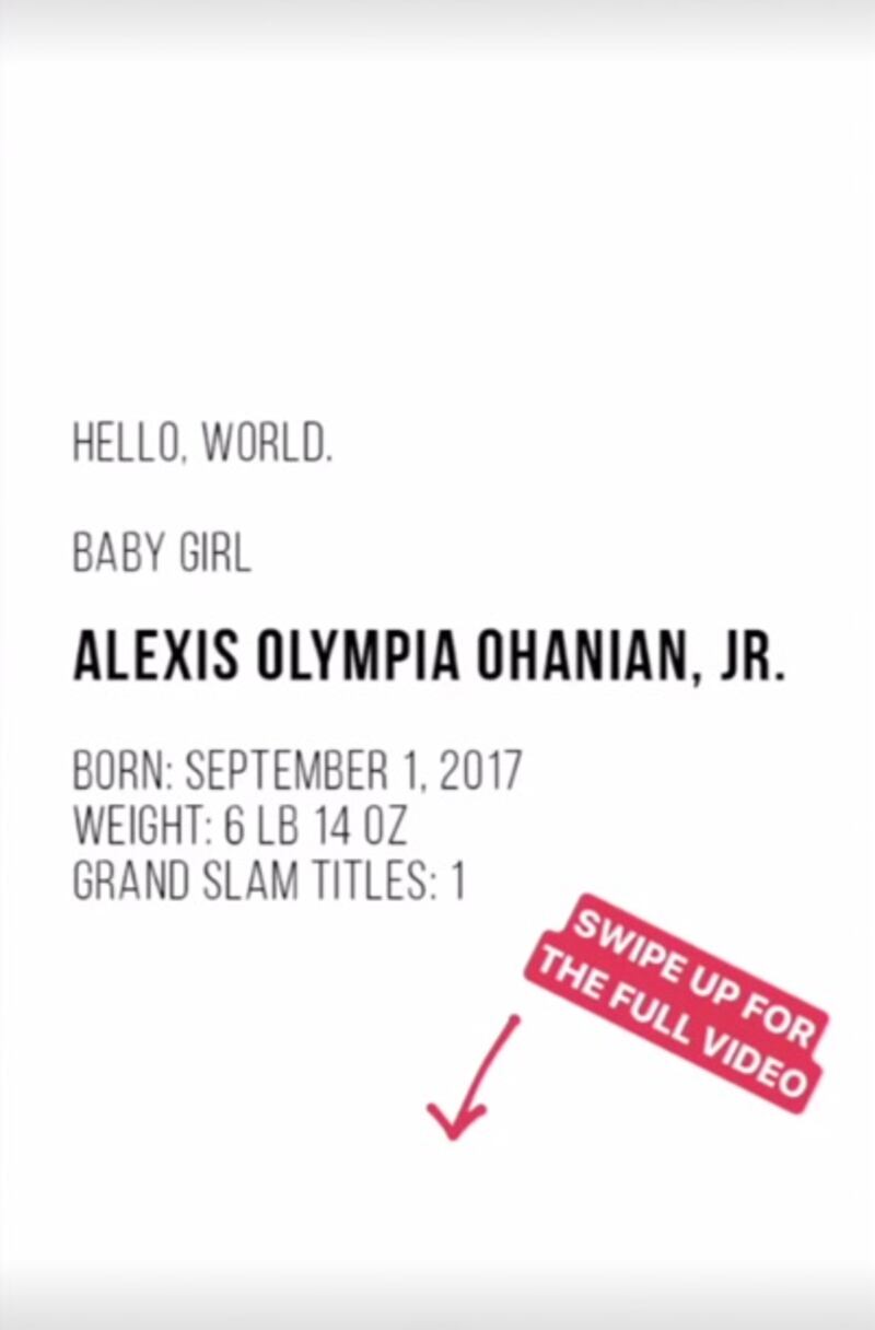 The daughter of tennis goddess Serena Williams and Reddit founder Alexis Ohanian made her first appearance on Williams’ Instagram Wednesday morning. Alexis Olympia Ohanian Jr. was born September 1, 2017, weighing six pounds 14 ounces. The Instagram post included a photo of Alexis Olympia sleeping peacefully on her mother’s chest. Williams even storied her daughter’s entire journey with a bio that listed “Grand Slam Titles: 1.”