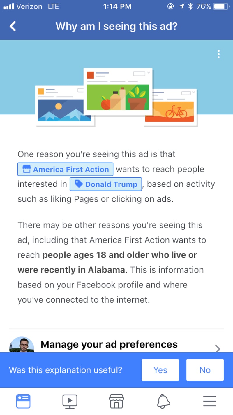None of those features are currently accessible to Alabamians being served ads by both pro-Roy Moore PACs, like America First Action, and, ostensibly, groups backing Democratic candidate Doug Jones, such as one called Alabama Values.