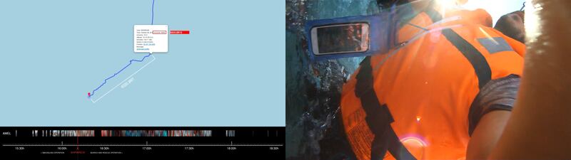 Shipwreck is produced by Forensic Architecture, a research agency based at Goldsmiths, University of London, which investigates human rights violations. FA had worked with Alzakout’s partner on a previous investigation, after which he informed them of footage that she had filmed during her fateful crossing, using a waterproof camera attached at the wrist. (“I decided to film my trip because I wanted to keep this unusual memory and share it with my partner later,” explains Alzakout.) Although the camera switches on and off, it captures the boat going down in the Aegean, as well as the hours that the shipwrecked passengers spent in the water, waiting to be rescued.