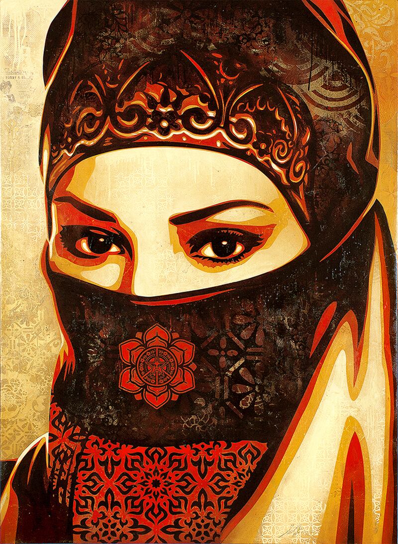 Since Islamophobia ratcheted up post-9/11 and the Iraq War started, I’ve made images to remind people that Arabs and Muslims deserve the same human rights as everyone else and should not be viewed with irrational suspicion. When I look at humanity in general, I think most people want to live their lives in peace. I frequently refer to the Dalai Lama when he asks, “When human beings have so much more in common, why do we focus on our differences?” I named this series Universal Personhood because I read an article saying that Egypt had officially declared women to have equal personhood to men. In many countries Arab or otherwise, women are not treated as equals, but when you add the bias against Muslims from the West, I think that Arab and Muslim women face many challenges to reaching universal personhood. These paintings are a celebration of feminine strength and humanity—something I’ve grown to appreciate much more as a father with two daughters now.