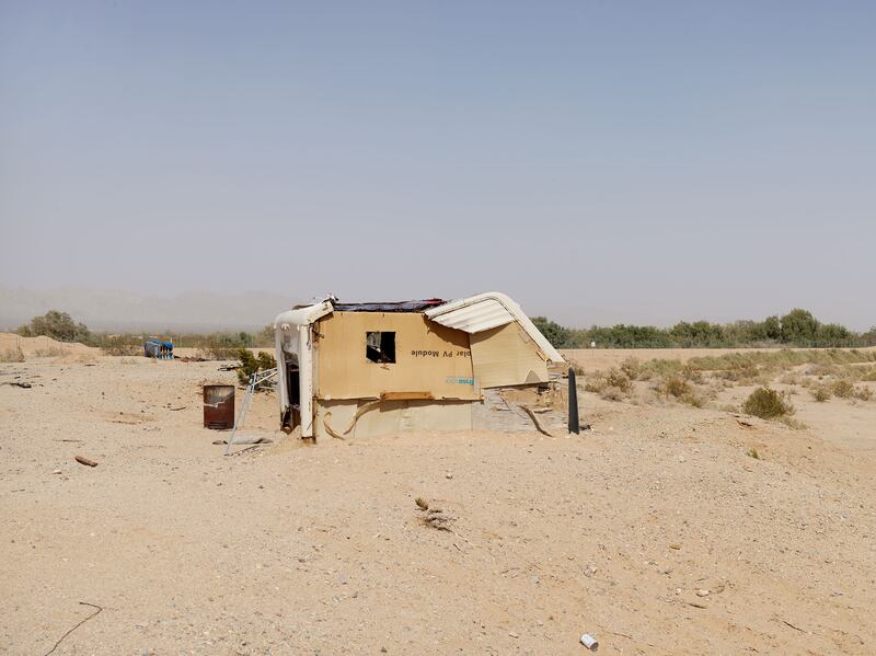 Over the rails, the Niland Gas Turbine Plant rises on the left, its military gray stacks and chillers giving form to the infrastructure necessary to power the Valley’s irrigation system. Cooling is difficult in this climate, so Imperial Irrigation District trucks in demineralized water from El Centro thirty miles south. A little farther on the left, a solar farm—another energy project of the last decade—glints in the morning sun. One hundred thousand panels slant back westward, catching the same cloudless sun filling your car’s mirrors. Later in the afternoon, you will see cardboard boxes and shipping pallets for these solar panels cast in Slab City’s structures and blown against its fencerows and carpeting its trodden ground. On the right, shards of glass—littered tesserae—flicker in a waste collection field scraped, flattened, and now marked with signs No dumping. It is illegal. Here the road becomes rougher in cadence and texture, a sensation born along this extended crossing. It will not end until you have returned from Slab City.