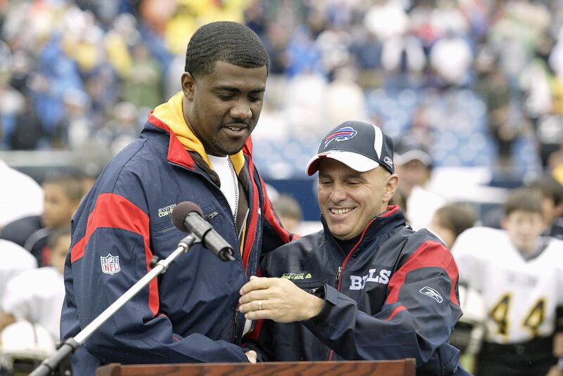 "ORCHARD PARK, NY - SEPTEMBER 7: Former Buffalo Bills player Kevin Everett hugs Buffalo Bills surgeon Andrew Cappucino after Everett received the George Halas award during halftime of the Seattle Seahawks and Buffalo Bills game at Ralph Wilson Stadium on September 7, 2008 in Orchard Park, New York. Everett received a severe spinal cord injury during Buffalo's first game of the 2007 season against the Denver Broncos.Cappucino was credited with giving Everett treatment that enabled Everrett to recover. (Photo by Rick Stewart/Getty Images)"