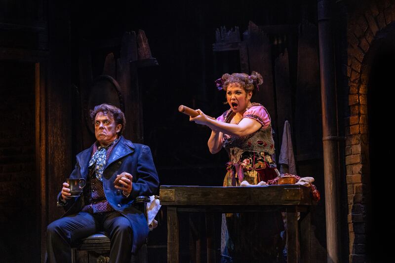 Throughout, George Reeve’s subtle projections reveal Sondheim’s face through the years, a fun duet with Andrew Lloyd Webber, his signature, and sheet music. Jill Parker’s costumes are the perfect kind of swanky. Warren Letton’s lighting is as prettily soft and sharply dramatic as the numbers require. The just-as-pristine staging and direction is by Matthew Bourne, with Matt Kinley’s design serving up a curved staircase, and specifics including a pie shop and chopping board for Mrs. Lovett.