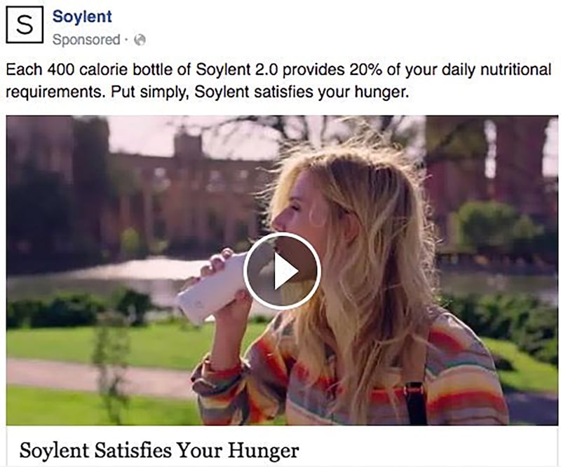 While Soylent said it focuses on millennials, the company did not respond to questions about which Facebook users were targeted with the ad showing a female model and Soylent’s calorie count. (Anecdotally, a number of my Facebook friends and I saw the ad; we’re all women under 30.)