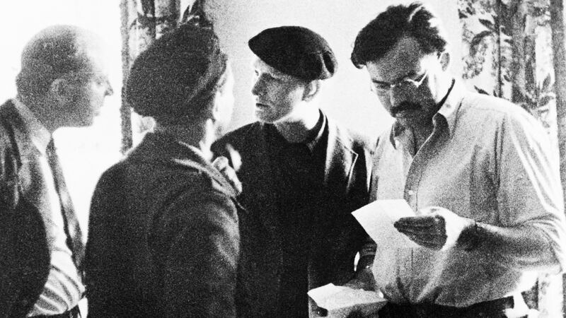 Ernest Hemingway with John Dos Passos, Joris Evans, and American bullfighter Sidney Franklin in Madrid during the Spanish Civil War.