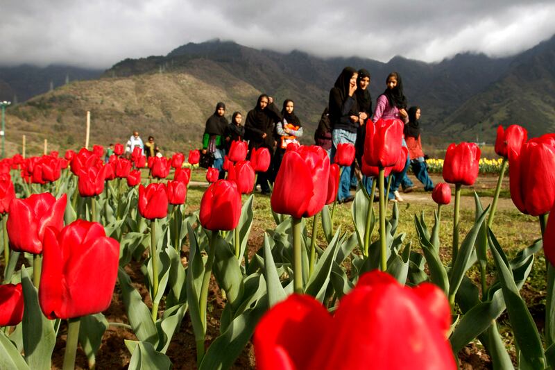 Kashmiri schoolchildren walk through a tulip garden on the outskirts of Srinagar, India, on April 3. Kashmir, known for its mountains, lakes, forests, and moderate weather, was one of Asia's most popular tourist destinations until a Muslim separatist rebellion broke out in the region at the end of 1989. With the situation improving, many tourists have started returning to Kashmir.