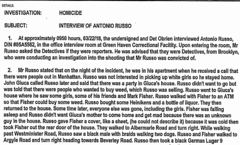 On March 22nd, the DA sent detectives upstate to interview Russo in prison. In that meeting, according to a police report known as a DD5, Russo confessed to killing Mark Fisher (the DD5 was sent by the prosecutor to Giuca’s attorney and the judge, and was characterized by the prosecutor as “potential Brady,” or exculpatory, material). Russo told detectives that he shot Fisher after he and Fisher left Giuca’s home and were walking several blocks away on Argyle Road. Russo also said that the “gun was his” and that he “had it for awhile and shot someone else with it.” The DD5, which summarizes Russo’s comments but does not include the detectives’ questions, also notes that “he could not say where he got [the gun] nor how long he owned it.”