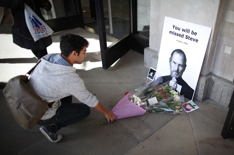 Richard Raucci lights a candle at an impromptu memorial paying tribute to Steve Jobs outside the Apple store at Union Square in San Francisco, California.