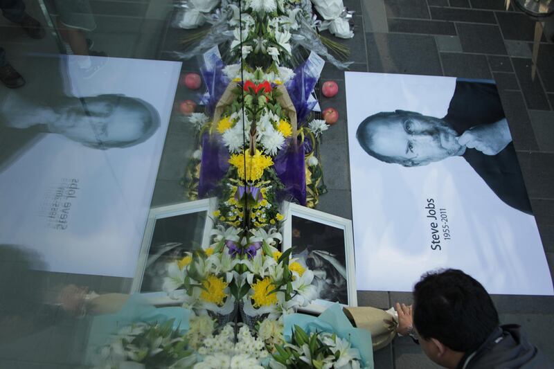 Flowers and candles are laid in tribute to Steve Jobs outside Sydney's Apple store..