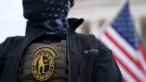 Prosecutors on Monday also showed jurors surveillance video taken after the insurrection that showed Watkins, Caldwell, and another Oath Keeper saluting each other at a hotel. Other militia members were also seen in the footage hauling large cases into their hotel rooms—which prosecutors allege continued weapons.