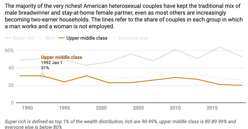 We found that, in 2019, 53 percent of super rich heterosexual couples had arrangements in which the woman was not gainfully employed, compared with 27 percent of rich couples, 20 percent of upper-middle-class couples and 26 percent of less affluent couples.