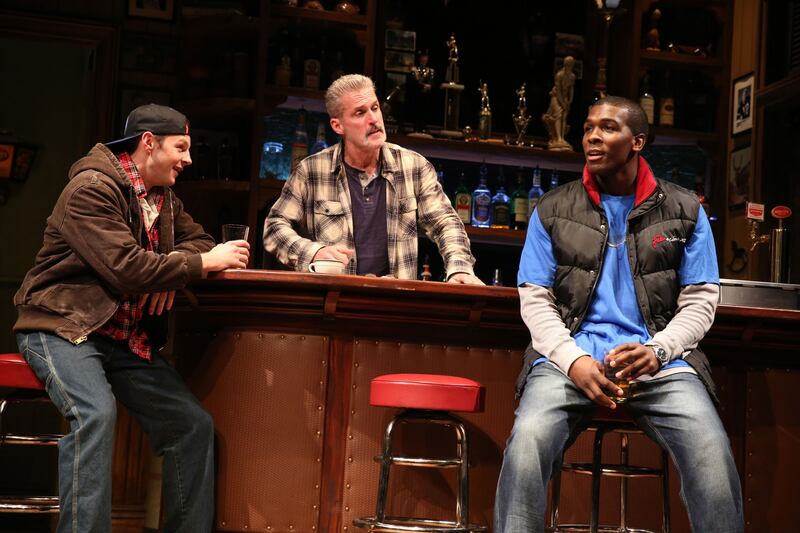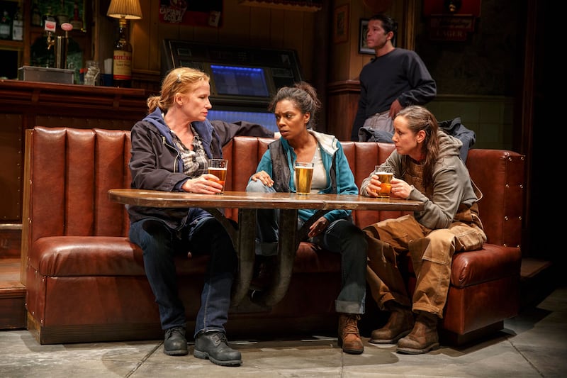 In 2000, when we first meet Cynthia (Michelle Wilson), Tracey (Johanna Day), and Jessie (Miriam Shor), they are kicking back in the local bar—so evocatively designed by John Lee Beatty you can almost smell the spilled beer—after another hard day at the factory where they work.